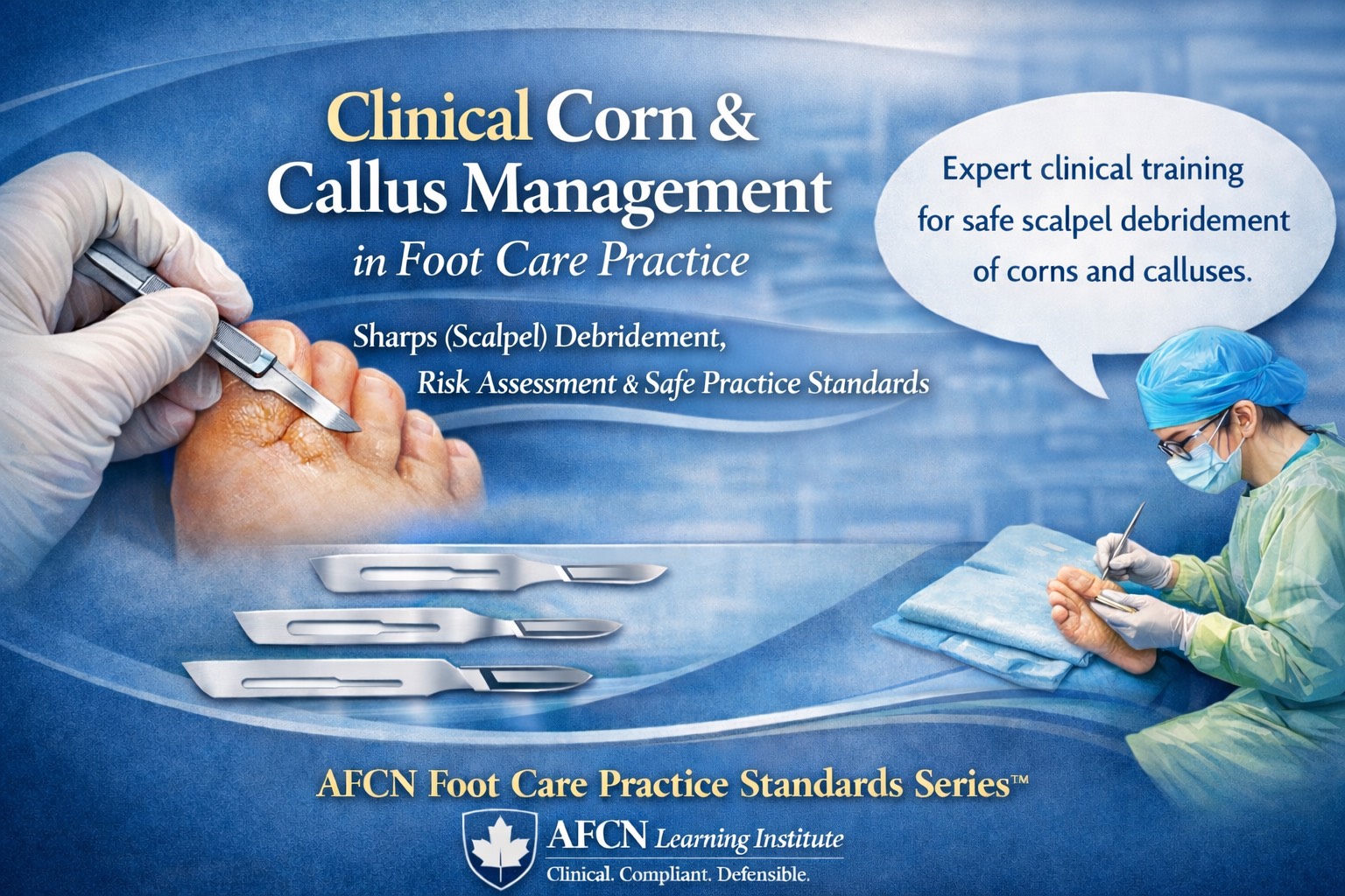 Join our online ZOOM course to master the treatment of corns and calluses. Gain experience using scalpels, blades, and other tools under the guidance of very experienced clinical educators in the field of foot care. After the course, continue practicing and enhancing your skills to become a confident advanced practice foot care nurse.